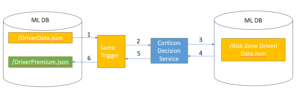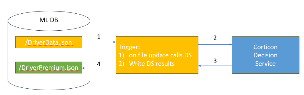 This is the simplest way to use a Corticon decision service. In step 1 in the diagram above, the trigger executes when the file is updated and calls the decision service (step 2). In step 3, upon completion, the decision service returns the results which are inserted into the MarkLogic database in step 4.