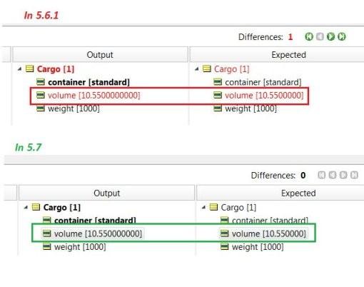In past versions, if a decimal value in the output data of a Testsheet had the same value as the expected data but a different number of trailing zeros, Studio considered those decimals different results and highlighted them in red text.