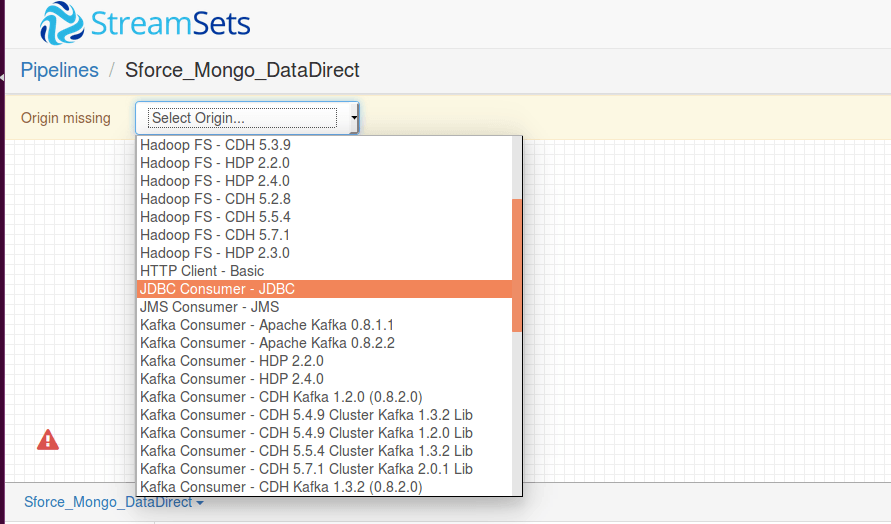 - On the pipeline configuration page, click on "Select Origin" drop down and choose JDBC consumer as your origin. The following is a screenshot for your reference: