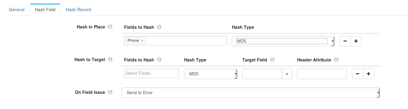 - In the configuration menu of the Field Hasher, go to the "Hash Field" tab. In the Fields to Hash under Hash in Place, enter the name of the field or column with forward slash as prefix. For example, ‘/PHONE’. Enter the same value for Target Field under Hash to target.