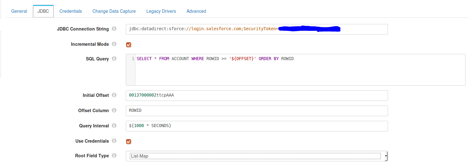 - Go to the Legacy Drivers tab and for the JDBC Driver class name field, fill it as com.ddtek.jdbc.sforce.SForceDriver. With this we are done configuring the JDBC consumer stage.