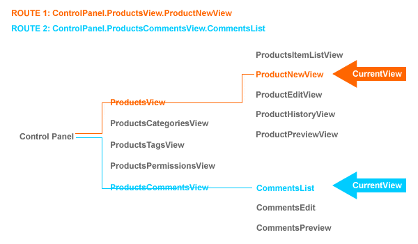 In the image above, we see two different routes. If you are accessing the orange route (ControlPanel.ProductsView.ProductNewView), first the ControlPanel View will be loaded, then the ProductsView View will be loaded and finally the ProductNewView View will be loaded. The last loaded View is always the current View, and on the screen the user interface of that View will be displayed.