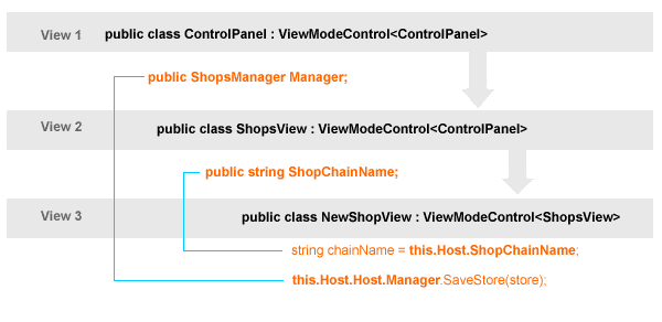 The image above depicts an imaginary hierarchy of Views, where the top level View is Control Panel, followed by ShopsView and finally the last View in the current hierarchy is NewShopView. Since all the ViewModeControls have Host property, we can call the Host property to access the immediate parent, but since immediate parent is also a View mode control, we can also call it’s Host property to access its parent and so on.