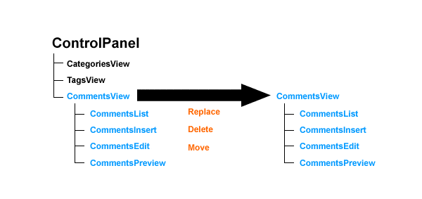 As the diagram suggest, from the View hierarchy on the left we can remove the CommentsView and all the child view, such as CommentsList, CommentsInsert, CommentsEdit and CommentsPreview will be removed as well. The hierarchy beneath CommentsView will be completely change also if we replace the CommentsView View some other View.
