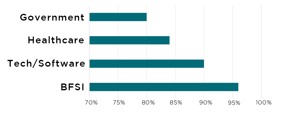 The results showed that data security and compliance with various data protection regulations are on the minds of the majority. 72% of respondents indicated that they transmit regulated data externally and 20% said they transmit non-regulated data externally. Further data illustrated that the healthcare is the industry that transmits the most sensitive data externally, followed by banking, financial services and insurance (BFSI), technology, and finally, government.