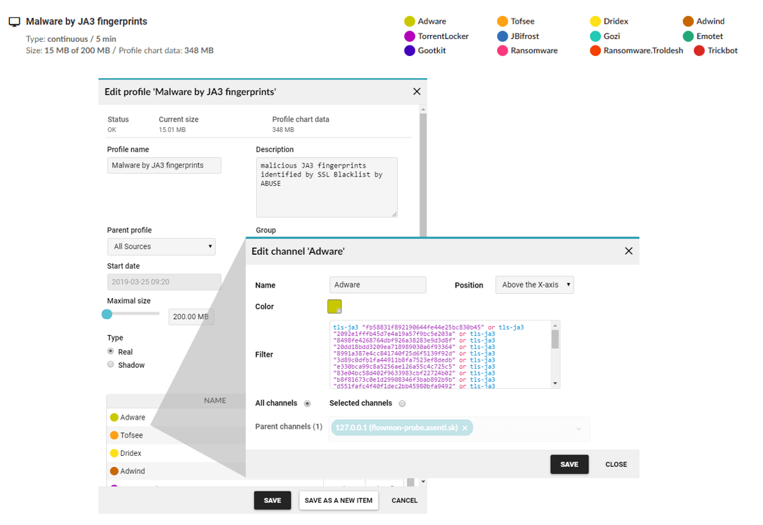 JA3 is a method for creating SSL/TLS client fingerprints that are easy to produce on any platform and can be easily shared for threat intelligence. TLS and its predecessor, SSL, I will refer to both as “SSL” for simplicity, enable encrypting communication for security reasons, but also allow attackers to hide malware. To initiate a SSL session, a client will send a SSL Client Hello packet following the TCP 3-way handshake. This packet and how it is generated depends on packages and methods used when building the client application. The server, if accepting SSL connections, will respond with a SSL Server Hello packet that is formulated based on server-side libraries and configurations as well as details in the Client Hello. Because SSL negotiations are transmitted in the clear, it is possible to fingerprint and identify client applications using the details in the SSL Client Hello packet.JA3 is a much more effective way to detect malicious activity over SSL than IP or domain based IOCs. Since JA3 detects the client application, it does not matter if malware uses DGA (Domain Generation Algorithms), or different IPs for each C2 host, or even if the malware uses Twitter for C2, as JA3 can detect the malware itself based on how it communicates, rather than what it communicates to. This is a straightforward way how to use Flowmon to find possible threats in connection with detecting specific JA3 fingerprints.