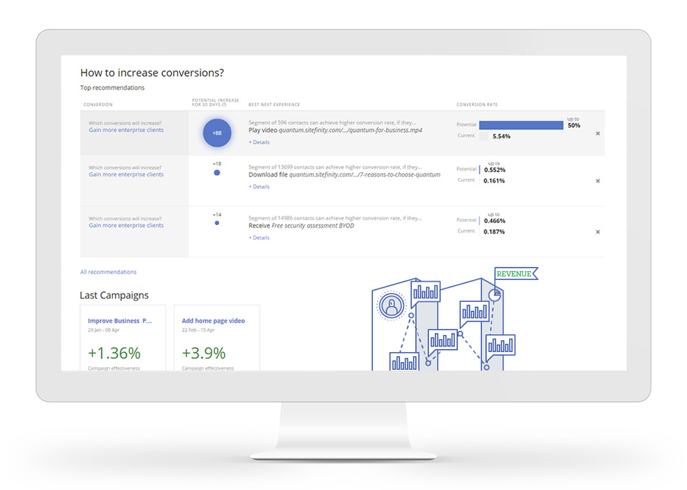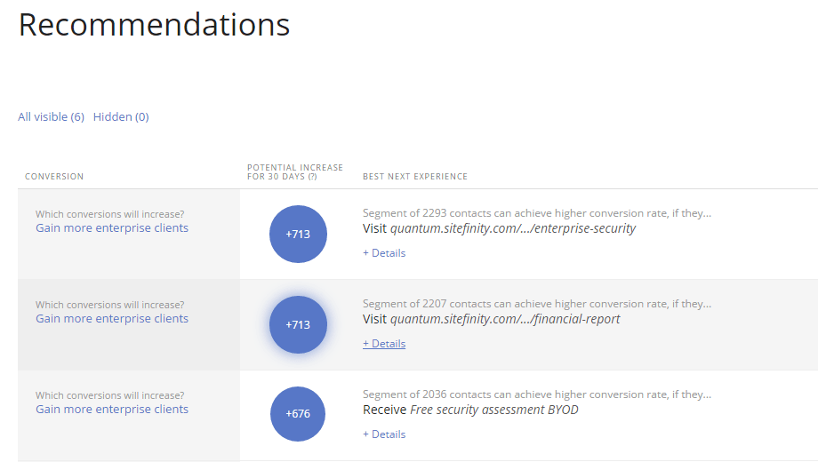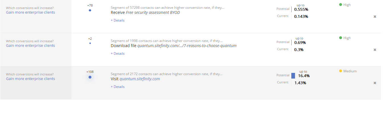Sitefinity Insight adds a layer of sophistication on top of this - it is less of a map and more of a GPS. Not only does it find the possible routes for you, or back to our practical example - creates your hypothesis - but it looks for optimal routes, in other words it looks for things you can do today that will impact your goals and conversions most, bringing in the biggest number of net new converters you would have normally missed out on. Sitefinity Insight also looks at your past efforts and indicates which ones are being beneficial for your goal and which ones - not so much.