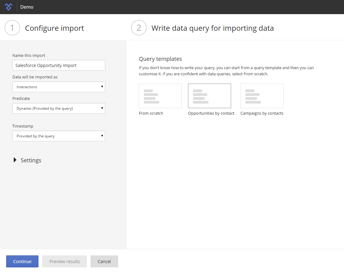 With the July release we are adding more integrations, so that this part becomes very easy for you. We are providing connections to salesforce.com, Microsoft Dynamics CRM and Oracle Eloqua, so that with a couple of clicks you will be able to pull data such as opportunities, contacts, campaigns, email engagements and so on.