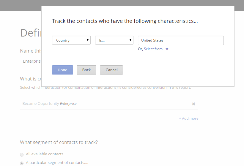 In our GPS analogy you can set your destination in the form of a goal - this goal can be online purchases, opportunities, quote requests etc. But let’s just say you are focusing on one specific geography or one specific audience type. Well your goals can only look at people from Canada, people with specific job titles or people with specific fields in CRM associated with them such as VIP clients and existing customers. This type of filtering helps you not only monitor the conversion rate within these special cases, but it gives you the Predictive Analytics and Attribution for these audiences. Here are examples of some of the things you can do.