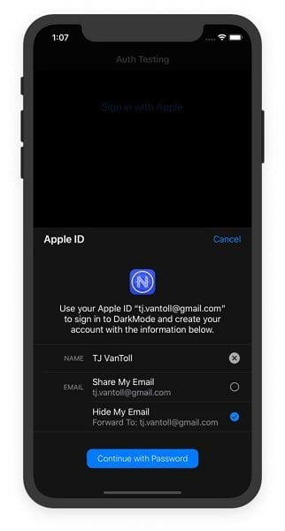 An example of ‘Sign in with Apple’ in action in a sample app.