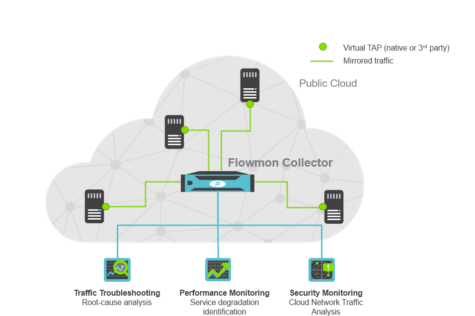 Virtuální TAP zrcadlí síťový provoz na monitorovací porty Flowmon kolektoru (s vlastní funkcí pro generování záznamů IPFIX/NetFlow). Síťové statistiky IPFIX umí přímo poskytnout také některá zařízení třetích stran. Flowmon podporuje vTapy nejvýznamnějších výrobců jako jsou Keysight, Gigamon nebo Garland.