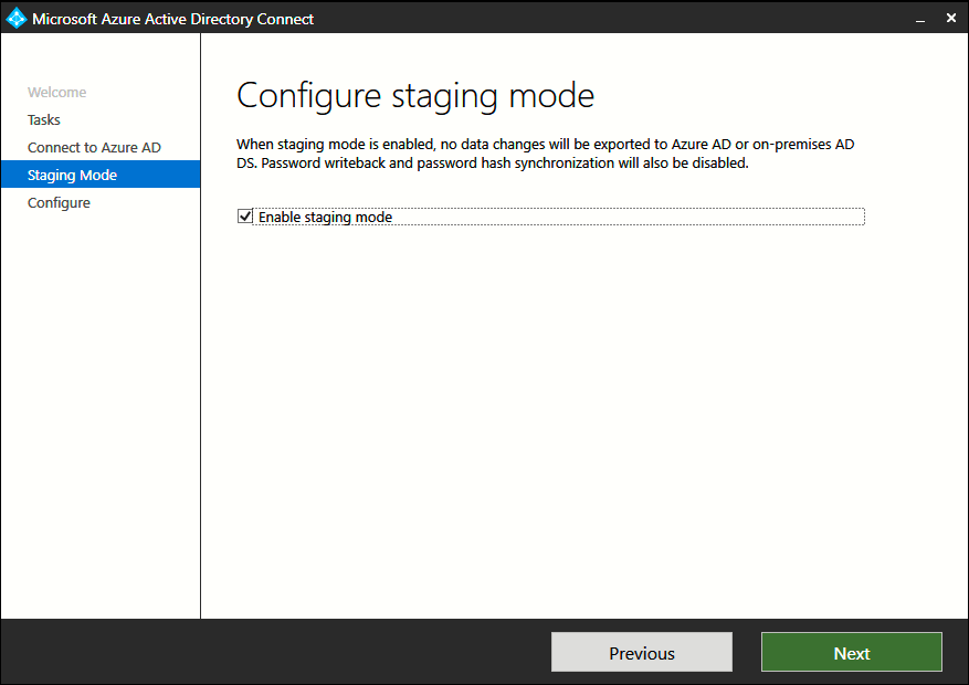 Die von Microsoft empfohlene Methode zum Definieren einer Hochverfügbarkeitsinfrastruktur für Azure AD Connect besteht darin, mindestens einen anderen Azure AD Connect-Server in Ihrer lokalen AD DS-Umgebung (Active Directory Domain Services, Active Directory-Domänendienste) bereitzustellen, diesen sekundären Server jedoch in den Stagingmodus zu versetzen.