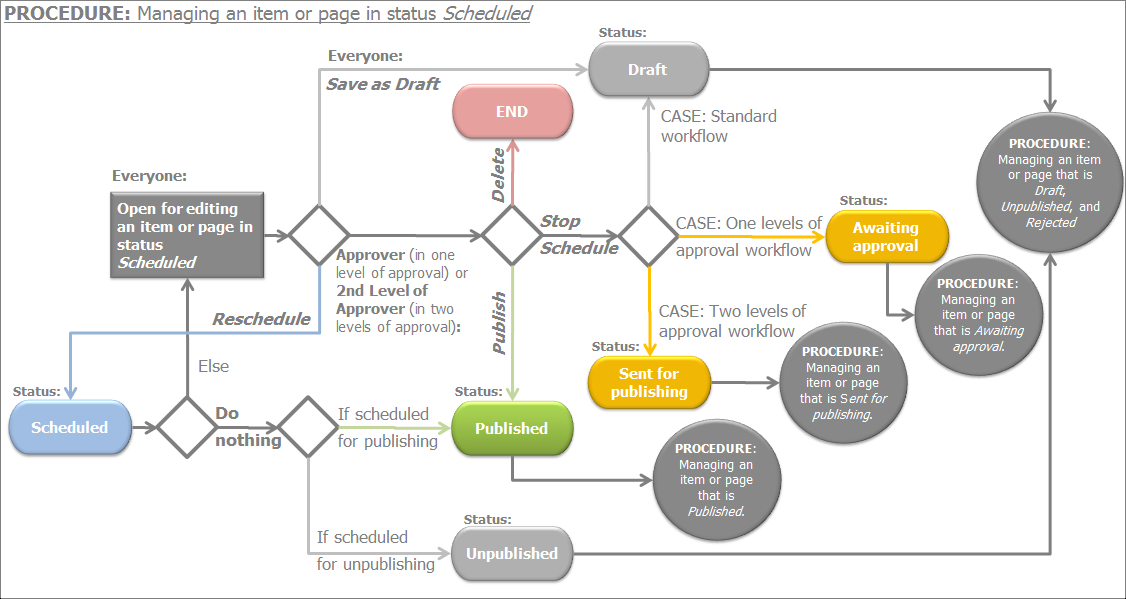 The following flowchart displays all available steps when you have opened for editing a content item or page in status Schedule: