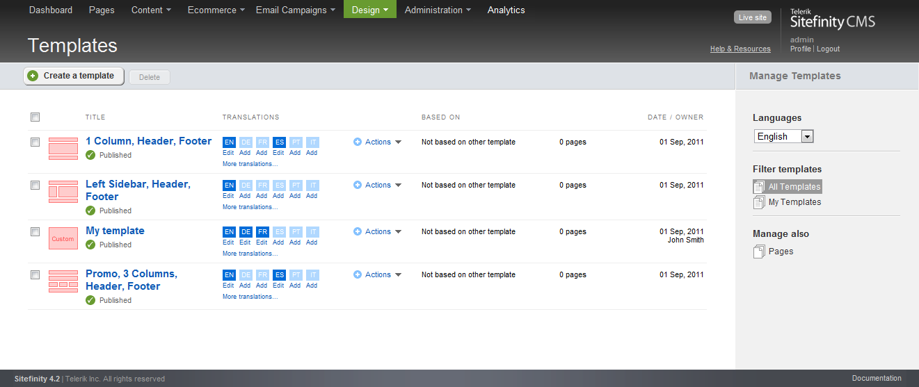 NOTE: Before you create a template in a different than the default language, you must have added this language in the settings of Sitefinity CMS. For more information, see Administration: Language settings.