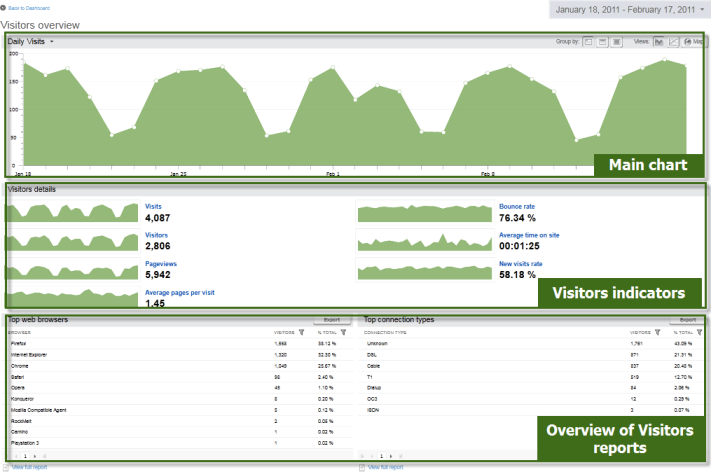 The Visitors overview page, displays the Visitors main report, which contains the most important information, indicators, and overview reports about the visitors of your website. The Visitors overview page is the entry point when you are browsing information about visitors and visits.