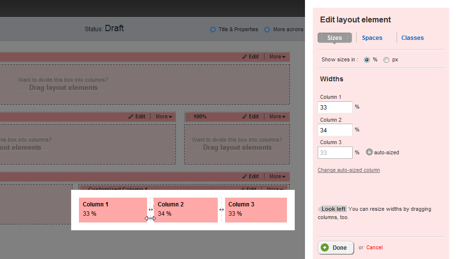 EXAMPLE: If you have chosen a layout element with three columns, you must enter the size for Column 1 and Column 2. You cannot enter in Column 3 – the size of the third column is automatically calculated.