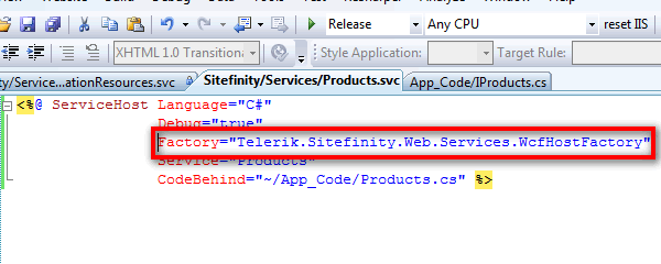 - In order to implement zero-configuration WCF REST service with Sitefinity CMS, you should open the newly created Products.svc file and set the Factory attribute on the service to Telerik.Sitefinity.Web.Services.WcfHostFactory like it is demonstrated in the following screenshot:
