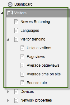 In the Visitors section you can view various statistics for the visitors of your website. The section contains one main report and various detailed reports located under the main report.