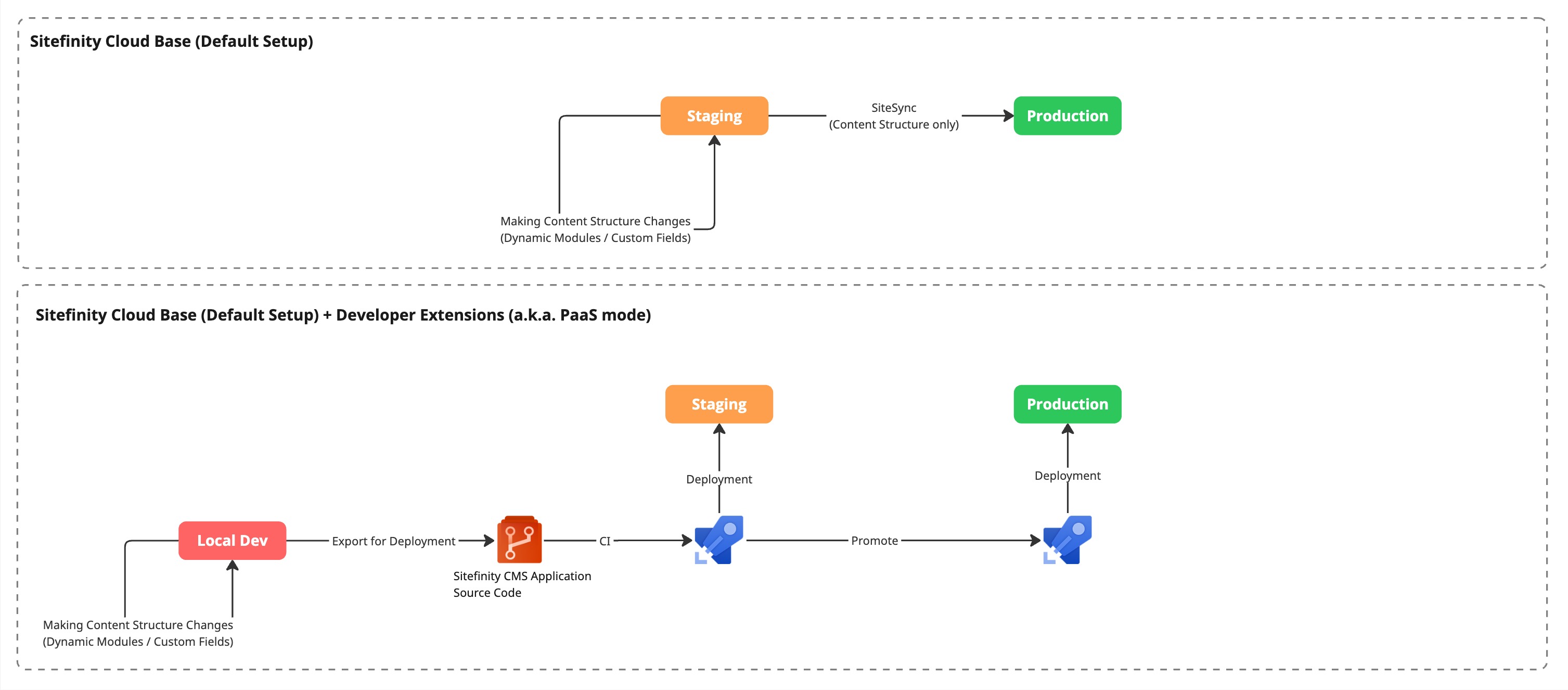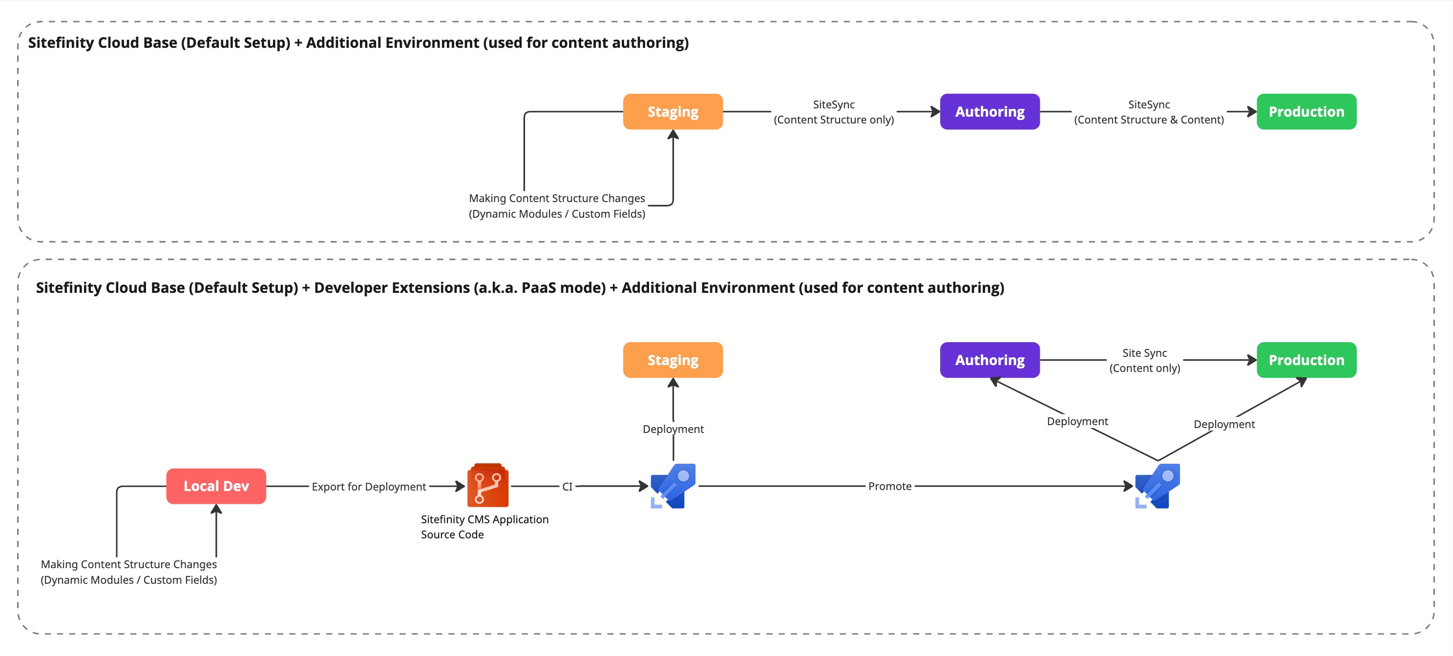 In this setup, content structure changes are not allowed directly on Sitefinity Cloud environments to avoid conflicts with changes done on local development environments. Using the source code also allows for comparing and merging changes made by different developers.