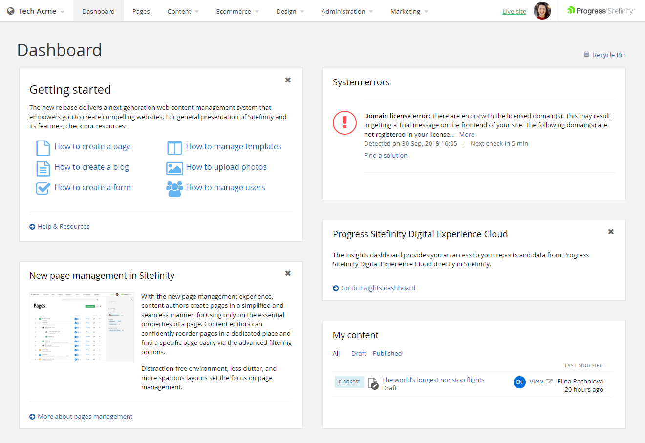 El área Dashboard es donde podemos ver la navegación de Sitefinity, los mensajes de estado del sistema y los enlaces a algunos recursos y videos adicionales de "introducción". Además, el Panel de control es el punto de entrada para la Papelera de reciclaje de su sitio web.