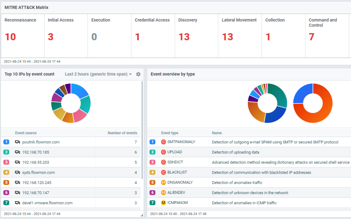 Flowmon ADS agrega la capa de defensa centrada en la red a su matriz de seguridad (consulte la tríada de visibilidad de SOC) para detectar las anomalías de red más leves que indiquen la actividad de amenazas desconocidas e internas indetectables por la seguridad perimetral y de endpoints. La visualización de incidentes contextual en el marco MITRE ATT&CK® lo mantiene informado sobre el alcance, la gravedad y el desarrollo futuro de la infracción.