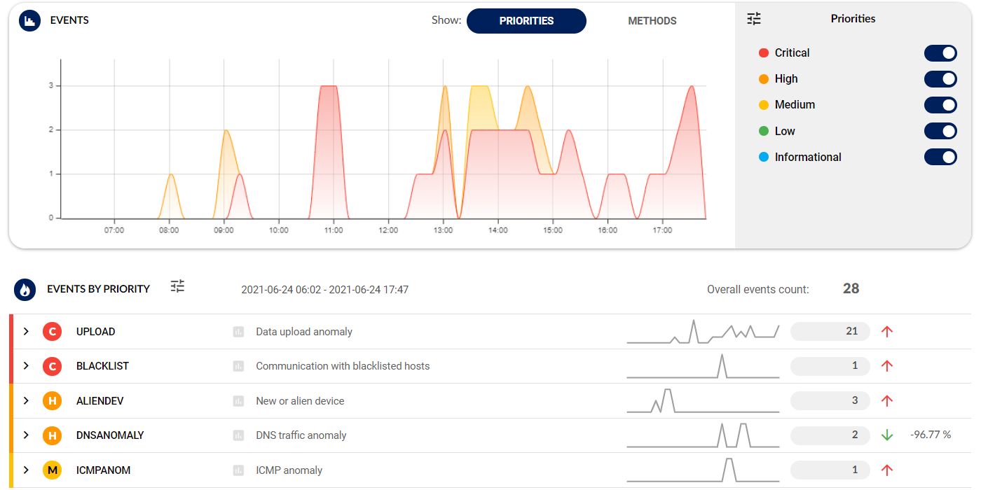 Enfócate solo en temas relevantes. El ADS distingue entre anomalías y tráfico normal y solo le avisa cuando se produce un peligro real. Los eventos de seguridad detectados se clasifican por gravedad, y la experiencia integrada de la solución mejora su conocimiento de la situación y acelera la clasificación y la respuesta.