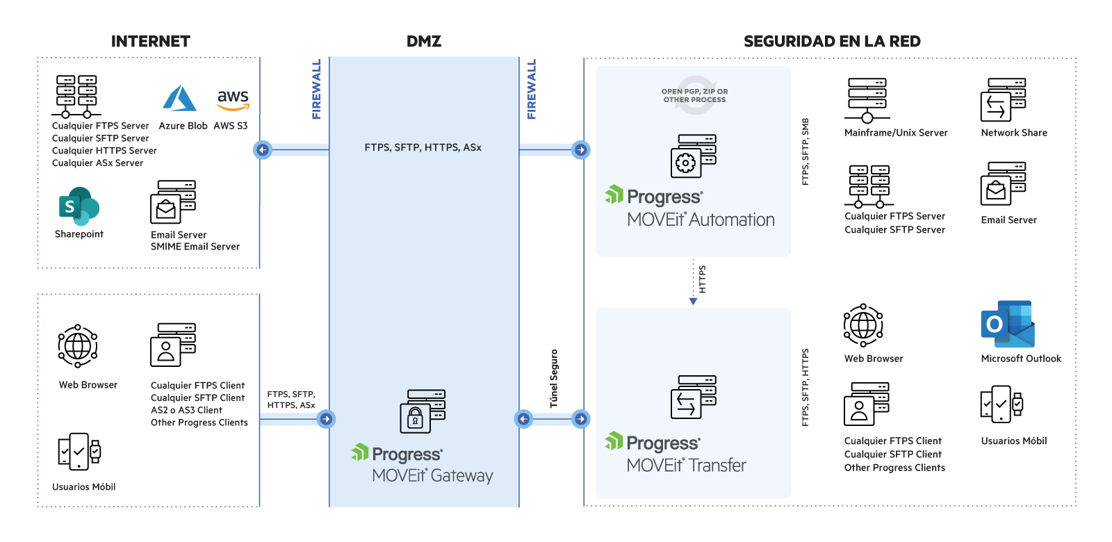 Progress® MOVEit® Automation se integra con Progress® MOVEit® Cloud, Progress® MOVEit® Transfer, endpoints en la nube (AWS S3, Azure Blob, SharePoint, Google Cloud Storage) y servidores SFTP y FTP/S para ofrecer funciones avanzadas de automatización de flujos de trabajo sin necesidad de programar scripts. La configuración es sencilla, ya que tiene tareas que vienen listas para usar y se pueden configurar con simples clics, permitiendo orquestar miles de tareas en todos sus servidores administrados.