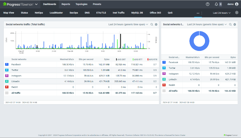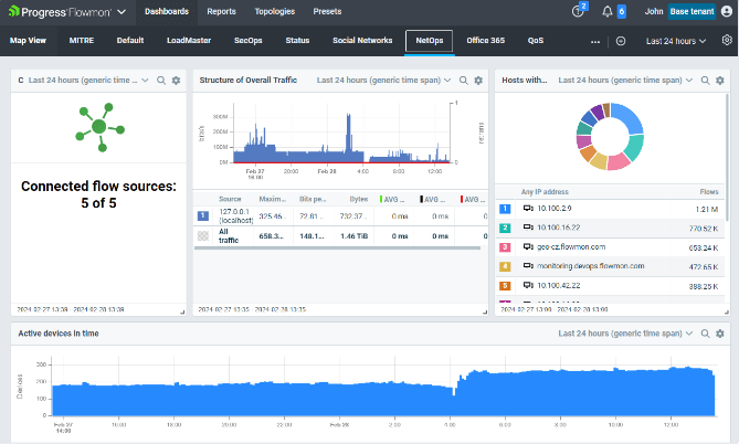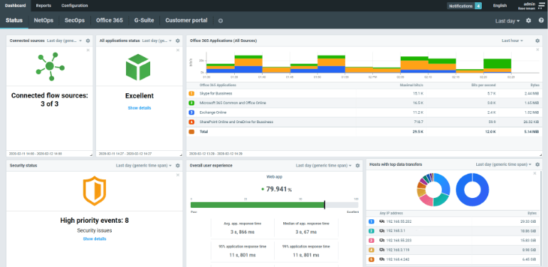 Choose from dozens of predefined dashboards such as top talkers, communication partners, users and endpoints, network vs. application delay, topology view showing bandwidth utilization or choose from prebuilt monitoring widgets for applications like Office365.