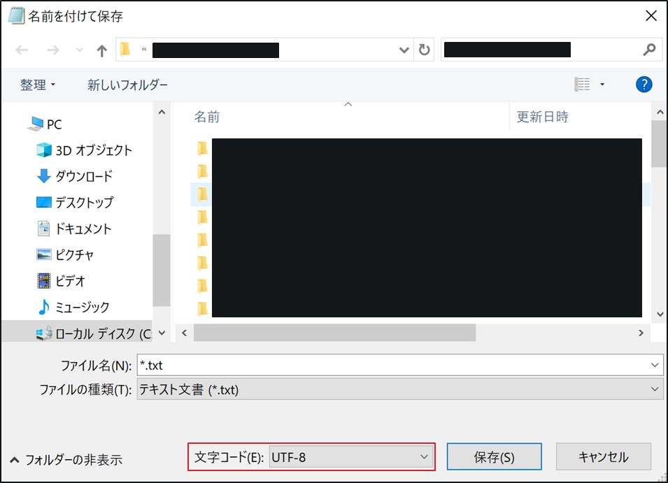 例)Windows標準のメモ帳を利用する場合、「名前をつけて保存」→文字コードとしてUTF-8を選択し、「保存」をクリックします。