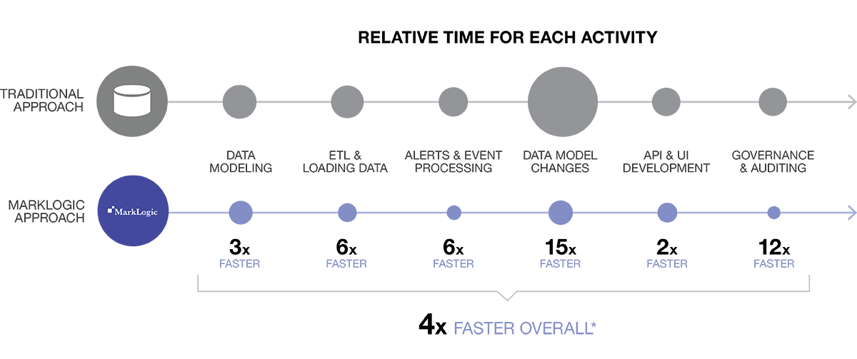 またプロセスがかなり高速になり、約4倍もスピードアップします。多くの Fortune 500 企業において MarkLogic と従来のリレーショナルデータベース + ETL のアプローチを直接比較してみると、大規模な MarkLogic プロジェクトは通常6か月で完了し、一方従来のアプローチでは2年かかっています。以下の図を見ると、一般的にどの部分の時間が短縮されるのかがわかります。