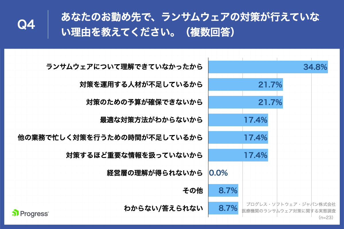 「Q4」では、Q2でランサムウェアに対する対策を「行っていない」と回答した方(n=23)を対象に「行えていない理由」(複数回答)を尋ねていますが、最も多かった回答は「ランサムウェアについて理解できていなかったから」(34.8%)でした。これからもランサムウェアに対する認知度の低さが、対策を進める上でのネックとなっていることがわかります。