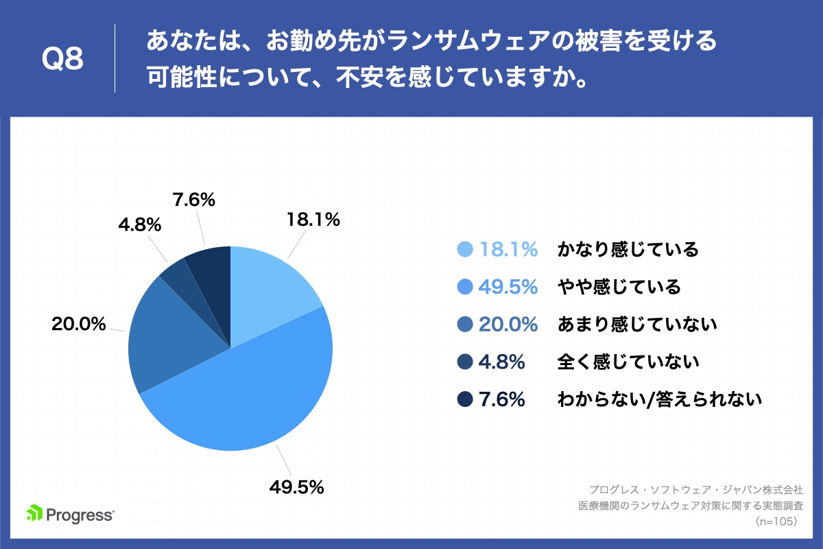 これを裏付けるのが「Q8」の「勤め先がランサムウェアの被害を受ける可能性について不安を感じていますか」(n=105)という設問です。18.1%が「かなり感じている」、49.5%が「やや感じている」と回答、調査に協力いただいた医療機関の7割近くがランサムウェアに不安を抱いていることがわかりました。