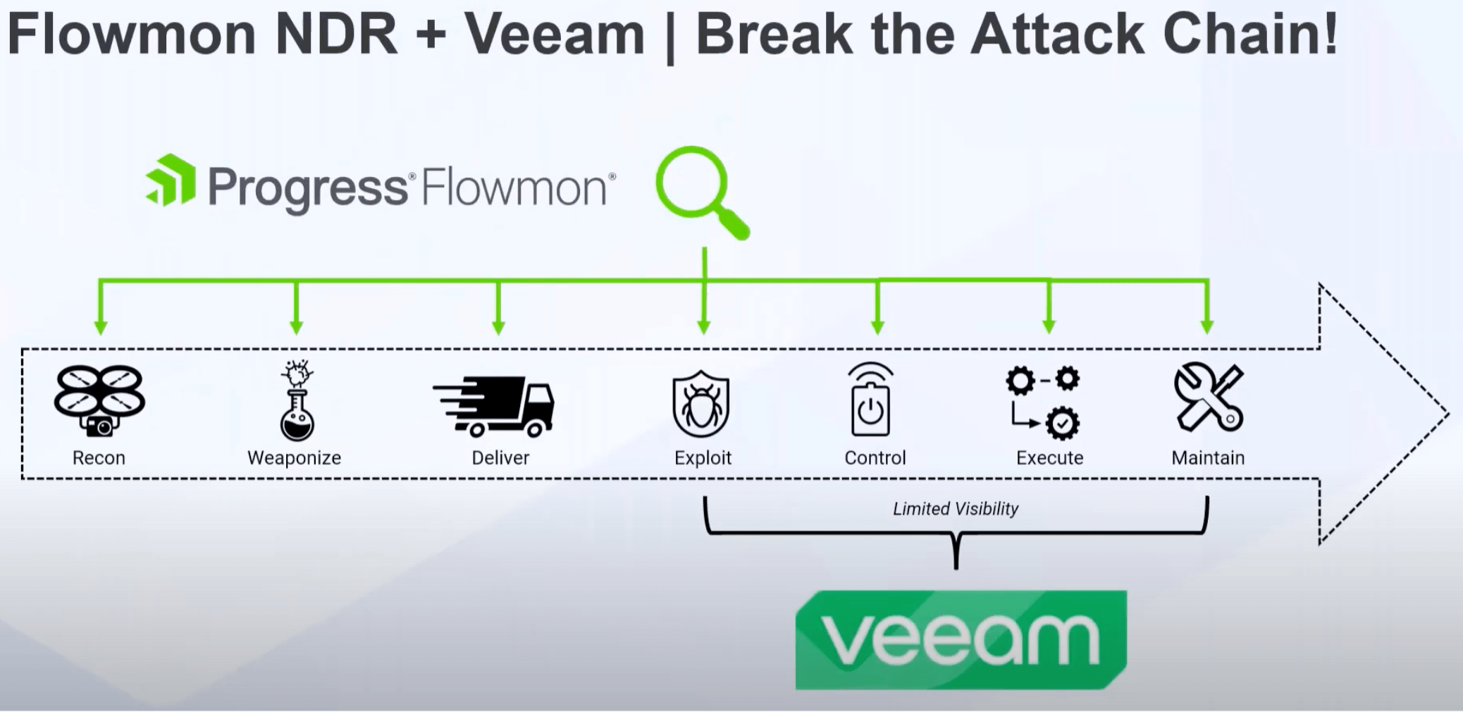 効果的な防御のためには、サイバー攻撃チェーンを理解することが重要です。Flowmon と Veeam を組み合わせることで、攻撃の多くの段階を断ち切ることができるツールセットが作成されます。Flowmon の早期脅威検出ソリューションと Veeam の堅牢なデータ保護およびリカバリ機能を組み合わせることで、攻撃ライフサイクル全体にわたって防御を行います。
