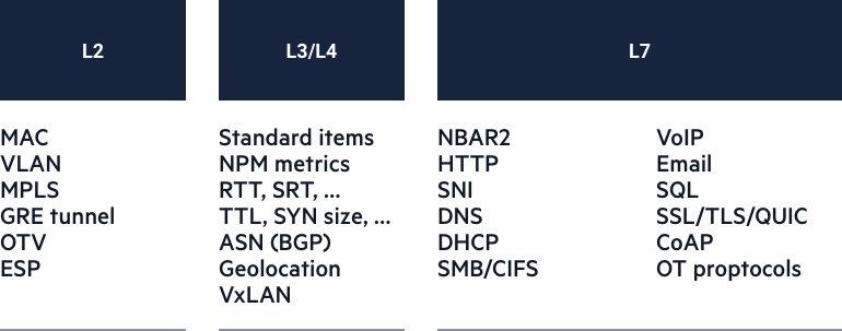 Flowmon には幅広い互換性があり、様々なシステムのネットワーク機能を強化できます。スイッチ、ルーター、ネットワークアクセスコントロール、ロードバランサー、パケットブローカー、ファイアウォールを活用して、ネットワークテレメトリ データをよりシームレスに送信できます。このソリューションは、独自のフォーマットを含む多様なトラフィックフロー標準をサポートしています。アプリケーション層をより深く理解するには、Flowmon Probe が有用です。