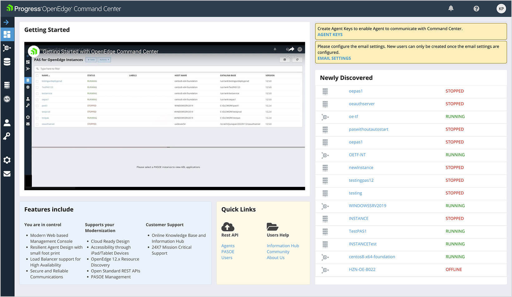 Built-in user management for system administrators ensures that you have secure control of OpenEdge Command Center user permissions in your environment. Ability to generate Agent Keys from server ensure authenticity of the agents.