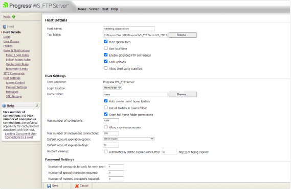Administre ou gerencie remotamente o WS_FTP Server em qualquer conexão com a Internet. Atribua permissões de usuários ou grupos para upload, download, exclusão, renomeação de arquivos e criação de diretórios. Habilite transferências de arquivos via FTP, SSH/SFTP e SSL/FTPS (implícito ou explícito).