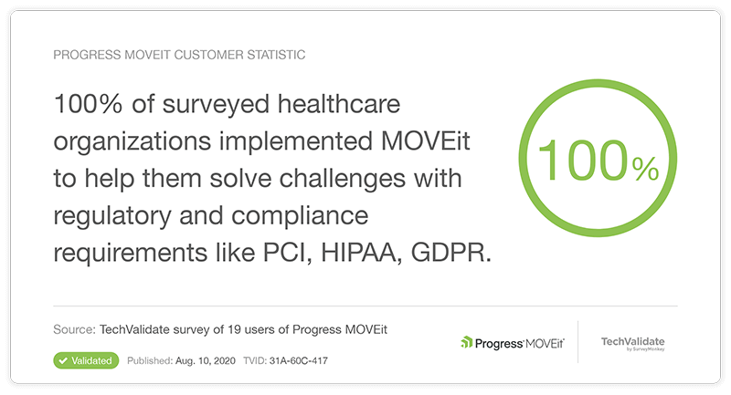Do faturamento da assistência médica às consultas de elegibilidade de seguro e pesquisas HCAHPS, o negócio da assistência médica depende da transferência confiável, segura e em conformidade de informações de saúde protegidas (PHI). A transferência segura e gerenciada de arquivos do MOVEit garante a criptografia dos dados em repouso e em movimento, a entrega ao destinatário pretendido e registros de auditoria detalhados. O MOVEit oferece os recursos e a flexibilidade de implementação necessários para estar em conformidade com HIPAA, PCI-DSS, GDPR e outros padrões líderes de segurança cibernética.