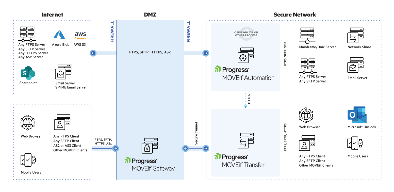 Progress® MOVEit® Automation works with Progress® MOVEit® Cloud, Progress® MOVEit® Transfer, cloud endpoints (AWS S3, Azure Blob, SharePoint, Google Cloud Storage), SFTP and FTP/S servers to provide advanced workflow automation capabilities without the need for scripting. Setup is simple with out-of-the-box, point-and-click task deployment to orchestrate thousands of tasks across your managed servers.