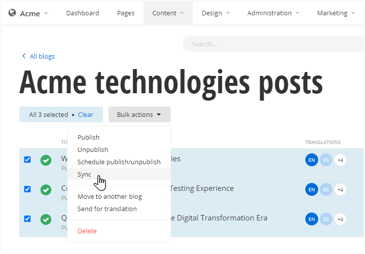 Content editors, depending on permissions, can now sync single or multiple items and pages with different states. This makes it easier to make small changes, such as fix typos, and allows administrators to focus on other tasks.