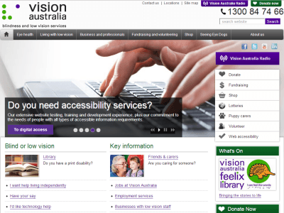 Vision Australia is a leading national provider of blindness and low vision services in Australia. Vision Australia is a not-for-profit organisation with client numbers of 50,000 and they are also a major participant and partner in the international blindness community. The website offers a variety of information for eye health, living with low vision, resources for professionals. For site visitors who wish to get involved and support the Vision Australia cause, there is the option to make donations online.