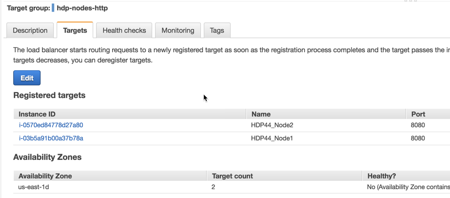- Once the ALB has been configured with the listener and target group rules, the targets should show as healthy for each target group if the instances are online and HDP is running.