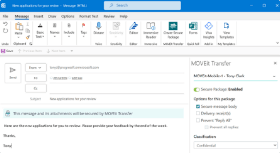 MOVEit Add-in for Outlook 能提供絕佳的使用者體驗,實現直覺簡便的安全檔案使用及互動。與 Ad Hoc Transfer Plug-in for Outlook 式不同,這款產品的一般使用者無需進行任何操作即可安裝或啟用 Add-in。無論是使用 MOVEit Cloud,或是使用 Azure 版或內部部署版 MOVEit Transfer,您皆能輕鬆運用 MOVEit Ad Hoc,在使用者對使用者的基礎上延伸安全檔案共用功能的適用範圍。